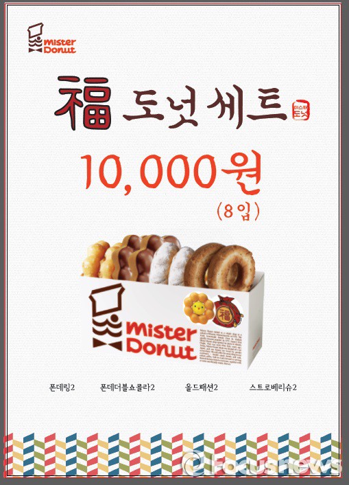 복 도넛세트는 △기본 도넛 ‘폰데링’ △초코 맛 ‘폰데더블쇼콜라’ △쿠키 도넛 ‘올드 패션’ △딸기를 넣은 ‘스트로베리 슈’ 등이 각 2개씩 8개로 구성됐다.