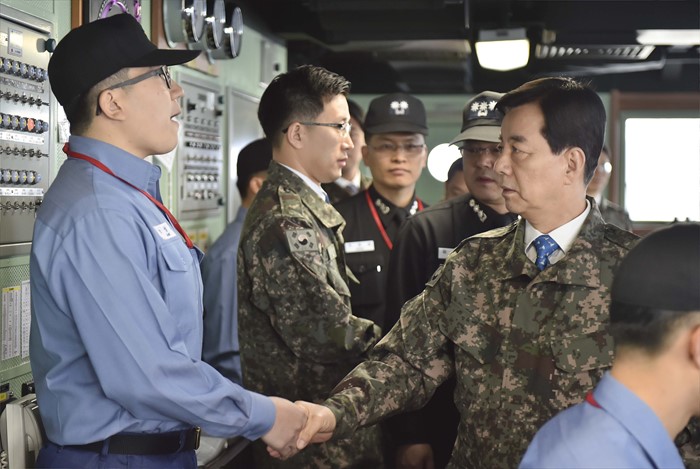 | △ 해군 이지스함 방문한 한민구 장관 |