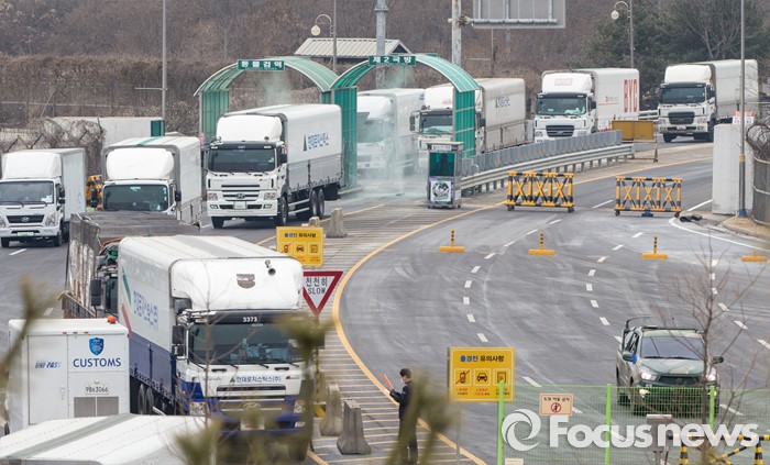 한편, 정부는 경협 보험금 지급, 일시적 자금애로 해소 지원, 세금 납부 유예 등을 통해 개성공단 전면 가동 중단 조치에 따른 입주기업들의 피해를 최소화한다는 방침이다.(파주=포커스뉴스) 11일 오후 경기 파주시 경의선 남북출입사무소에서 개성공단 화물차들이 입경하고 있다. 2016.02.11 양지웅 기자