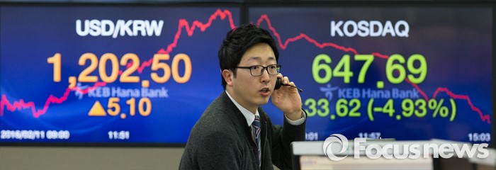 특히 대장주 셀트리온(-9.19%)을 비롯해 시가총액 상위주가 대거 급락했다. 코스닥 시가총액 상위 1∼10위 종목들은 4∼14%대의 낙폭을 기록했다.(서울=포커스뉴스) 코스닥이 북한 리스크와 해외 증시 급락 등 국내외 악재로 인해 전 거래일보다 33.62(4.93%) 포인트 하락한 647.69로 마감한 11일 오후 서울 중구 명동 KEB 하나은행 딜링룸에서 딜러가 업무를 보고 있다. 원달러 환율은 5.1원 오른 1202.5원으로 거래를 마쳤다. 2016.02.11 오장환 기자
