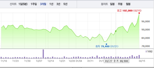 최 연구원은 “유럽은행의 위기론, 중국 환율 공격, 한국의 개성공단 폐쇄와 사드 배치 등으로 불확실성이 증폭되고 있다”며 “그렇지만 조선주의 주가는 이미 2년간 주가가 빠질 때로 빠졌기 때문인지 버티는 모습을 보여주고 있다”고 말했다.주가흐름<사진출처=네이버 캡쳐>