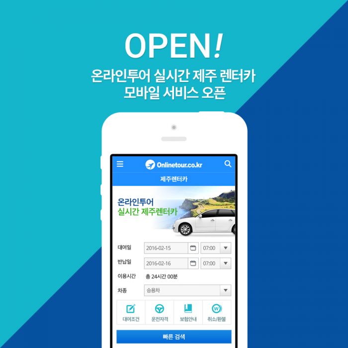 (서울=포커스뉴스) 온라인투어는 오는 16일 '실시간 제주 렌터카 예약·결제' 모바일 서비스를 오픈한다고 밝혔다.