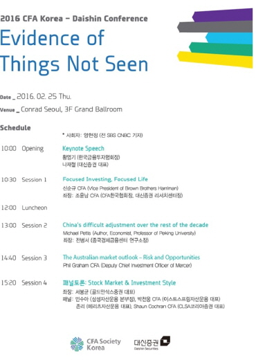 (서울=포커스뉴스) 대신증권은 CFA(공인재무분석사)한국협회와 오는 25일 여의도 콘래드 호텔에서 2016 CFA코리아-대신 컨퍼런스를 개최한다고 17일 밝혔다.