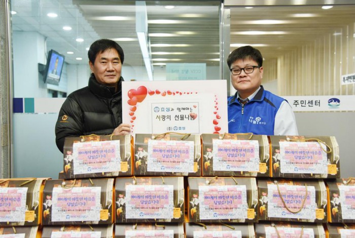 효성은 응모된 약 500개의 손하트 사진 중 100개를 선정해 하나의 큰 하트 이미지로 제작, 기부물품에 부착해 아현동 주민센터를 통해 마포구 저소득층 가정 100곳에 참치와 햄 세트를 기부했다.