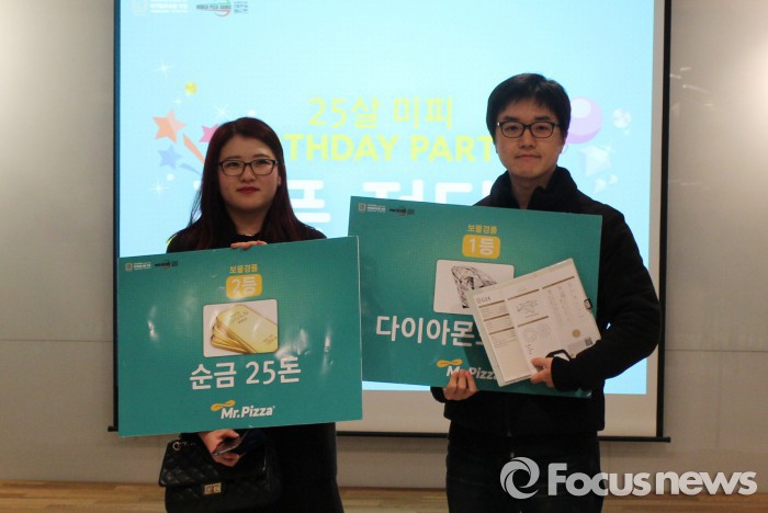 MPK그룹 관계자는 "이 행사는 1990년 이화여대 앞에 미스터피자 1호점을 개점한 이래 25년 동안 변함없이 사랑해준 많은 소비자들에게 보답하기 위해 마련한 것"이라며 "앞으로도 고객을 가장 먼저 생각하는 브랜드, 소비자가 가장 만족하는 브랜드로 거듭나기 위해 최선의 노력을 다하겠다"고 말했다.순금 25돈에 당첨된 이현아 씨(좌)와 다이아몬드 1캐럿을 받은 조민협 씨(우) <사진제공=MPK그룹>