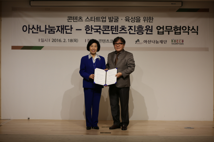 한국콘텐츠진흥원은 18일 서울 종로구 동숭동 콘텐츠코리아랩 콘퍼런스룸에서 아산나눔재단과 업무협약(MOU)을 체결했다. 업무협약은 △2016~2018년까지 3년간 '정주영 창업경진대회'를 통한 콘텐츠 스타트업 발굴 △정주영 창업경진대회 출신 창업자 및 멘토 네트워킹 행사 후원 △상호 보완적 파트너십 구축 등의 내용을 담고 있다.