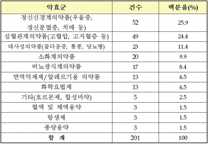 치료영역별 승인건수는 정신신경계의약품 52건(25.9%), 심혈관계의약품 49건(24.4%), 대사성의약품 23건(11.4%), 소화계의약품 20건(9.9%), 비뇨‧생식기계의약품 17건(8.4%), 화학요법제 13건(6.5%) 등의 순이었다.