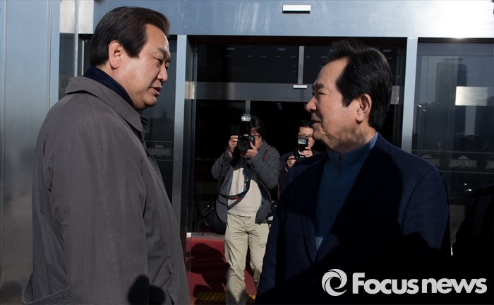 (서울=포커스뉴스) 24일 오전 서울 여의도 국회의사당 본청 앞에서 故 이기택 전 민주당 총재 4.19 민주사회장 영결식 참석 후 국회로 돌아가던 김무성 새누리당 대표가 정세균 더불어민주당 의원과 대화하고 있다.