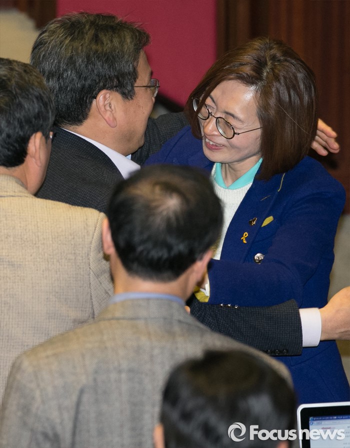 (서울=포커스뉴스) 테러방지법 직권상정에 반발해 야당의 무제한 토론(필리버스터)이 진행되고 있는 24일 오후 서울 여의도 국회 본회의장에서 토론을 마친 은수미 더불어민주당 의원이 동료 의원들의 격려를 받고 있다.