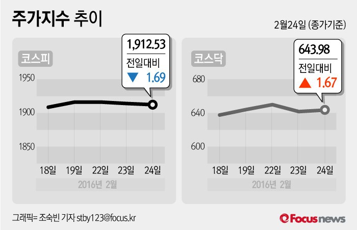 (서울=포커스뉴스) 24일 코스피지수는 전날 보다 0.09%(1.69포인트) 내린 1912.53에 장을 마쳤다. 코스닥지수는 전일 대비 0.26%(1.67포인트) 오른 643.98에 마감했다.