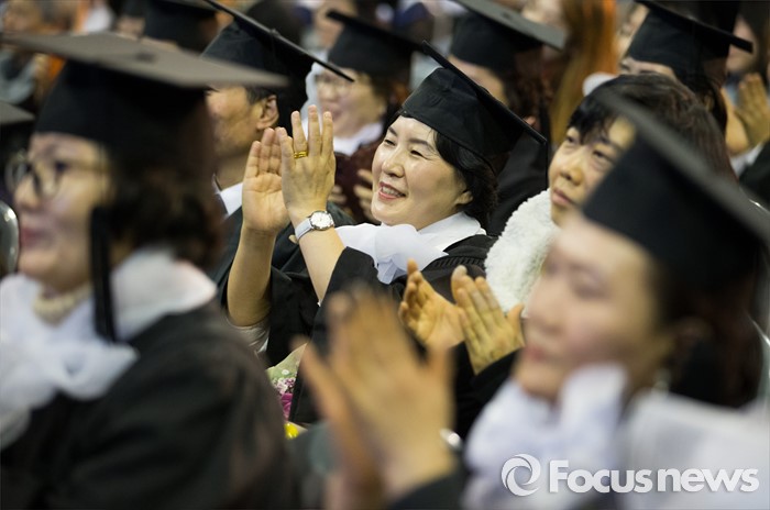 (서울=포커스뉴스) 24일 오후 서울 송파구 올림픽체조경기장에서 열린 '한국방송통신대학교 2015학년도 학위수여식'에 참석한 졸업생들이 박수 치고 있다.