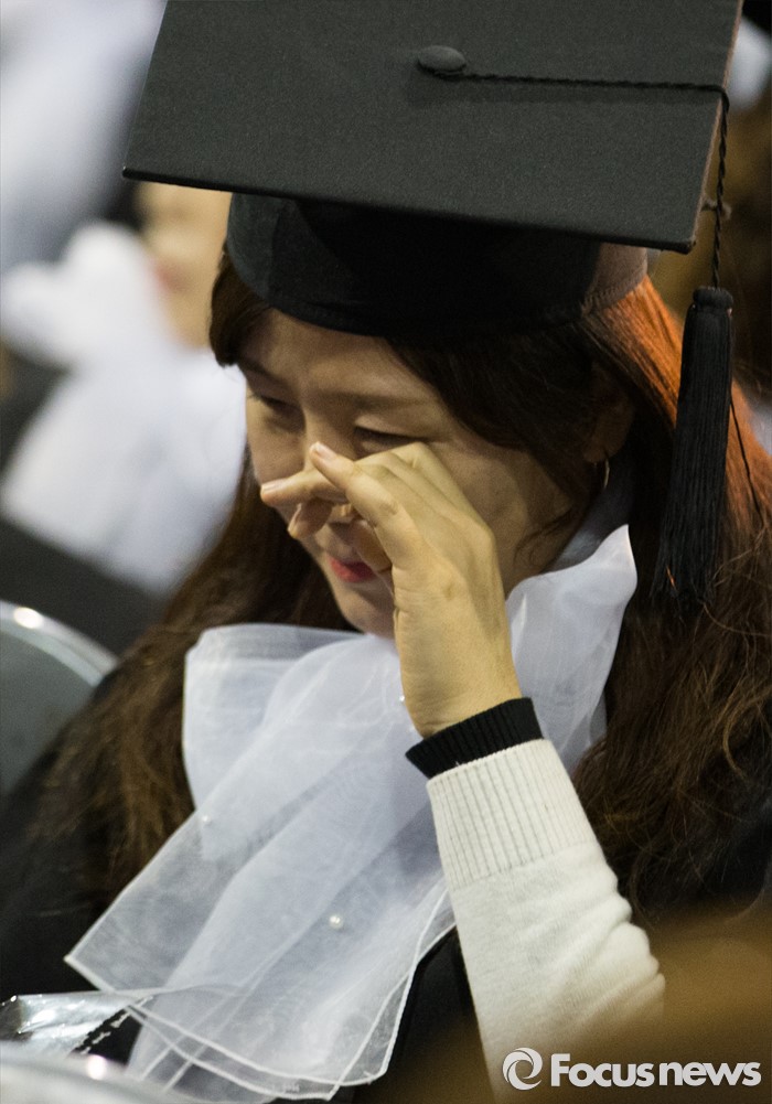 (서울=포커스뉴스) 24일 오후 서울 송파구 올림픽체조경기장에서 열린 '한국방송통신대학교 2015학년도 학위수여식'에 참석한 졸업생이 눈물을 흘리고 있다.