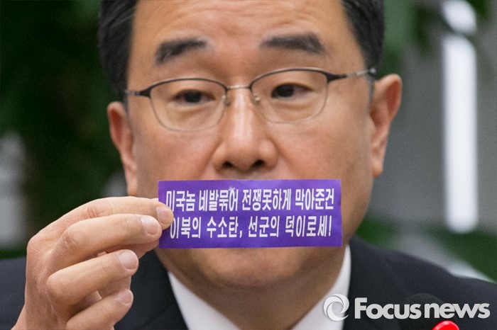 이어 "국회법 위반 발언자에게 즉각 퇴장을 지시해 국회 질서를 바로 잡아 달라"며 "국회의장이 제지를 하지 않는다면 국회법 위반에 대한 책임을 공동으로 져야할 것"이라고 말했다.김정훈 새누리당 정책위의장이 18일 오전 서울 여의도 국회에서 열린 최고위원회의에 참석해, 국회 경내에서 발견된 전단지를 들어보이고 있다. 2016.02.25 박철중 기자