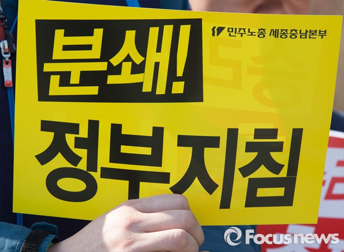 (세종=포커스뉴스) 25일 오전 세종시 정부세종청사 국무총리실 앞에서 민중총궐기 충남 운동본부 구성원들이 기자회견을 열고 박근혜 정권 출범 3년 민중궐기대회에서 민중의 분노를 보여주겠다고 주장하고 있다.