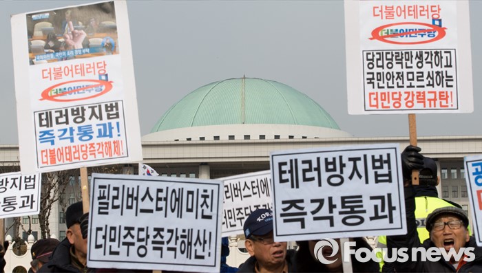 (서울=포커스뉴스) 25일 오전 서울 여의도 국회 앞에서 어버이연합을 비롯한 보수단체가 야당의 테러방지법 반대를 위한 무제한토론(필리버스터) 중단을 요구하며 기자회견을 하고 있다.