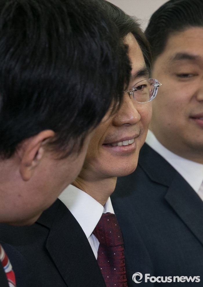 (서울=포커스뉴스) 25일 오전 서울 여의도 새누리당사에서 열린 20대 총선 공천 신청자 면접심사에 부산 사하을에 신청한 조경태 새누리당 의원과 예비후보들이 취재진 질문에 답하고 있다. 왼쪽부터 이호열, 조경태, 이용원 예비후보.