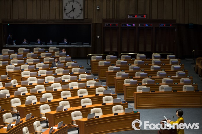 (서울=포커스뉴스) 김제남 정의당 의원이 25일 오전 서울 여의도 국회 본회의장 빈 의석들 앞에서 테러방지법 저지를 위한 무제한 토론(필리버스터)을 하고 있다.