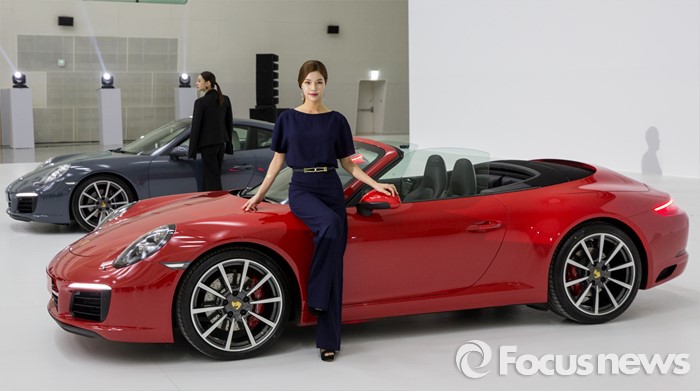 (서울=포커스뉴스) 25일 오전 서울 중구 동대문디지털플라자에서 모델들이 포르쉐 신형 911 카레라S(앞)와 911 카레라를 선보이고 있다.
