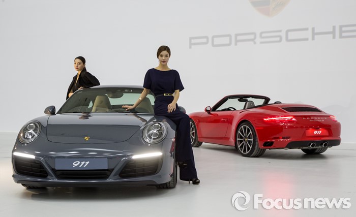 (서울=포커스뉴스) 25일 오전 서울 중구 동대문디지털플라자에서 모델들이 포르쉐 신형 911 카레라(왼쪽)와 911 카레라S를 선보이고 있다.
