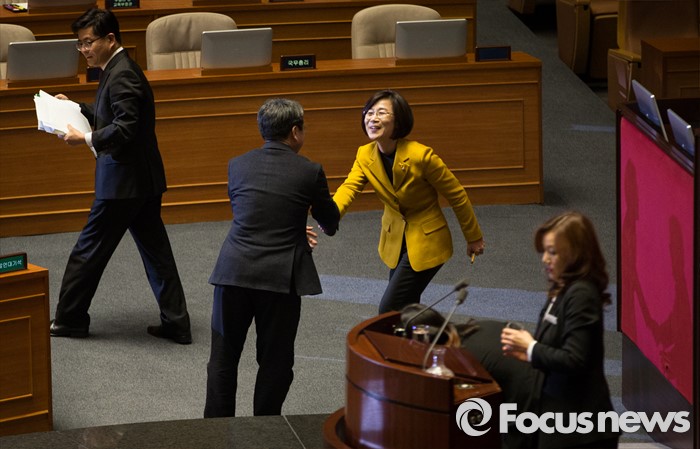 | △ '필리버스터', 토론 마친 후 격려 받는 김제남 의원 |