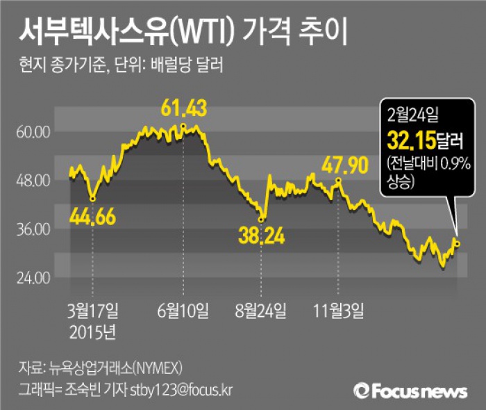 (서울=포커스뉴스) 24일(현지시각) 뉴욕상업거래소(NYMEX)에서 서부텍사스산원유(WTI) 4월 인도분 선물은 전날보다 0.9% 상승한 배럴당 32.15달러에 거래를 마쳤다.