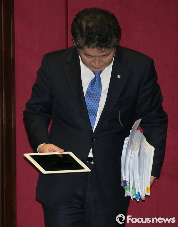 (서울=포커스뉴스) 테러방지법 직권상정에 반발해 야당의 무제한 토론(필리버스터)이 나흘째 진행되고 있는 26일 오전 서울 여의도 국회 본회의장에서 김경협 더불어민주당 의원이 토론을 마친 뒤 퇴장하고 있다.