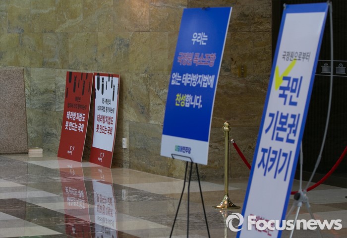 (서울=포커스뉴스) 테러방지법 직권상정에 반발해 야당의 무제한 토론(필리버스터)이 나흘째 진행되고 있는 26일 오전 서울 여의도 국회 본회의장 앞에 새누리당의 무제한 토론을 비판하는 피켓과 더불어민주당의 테러방지법 반대 배너가 함께 세워져 있다.