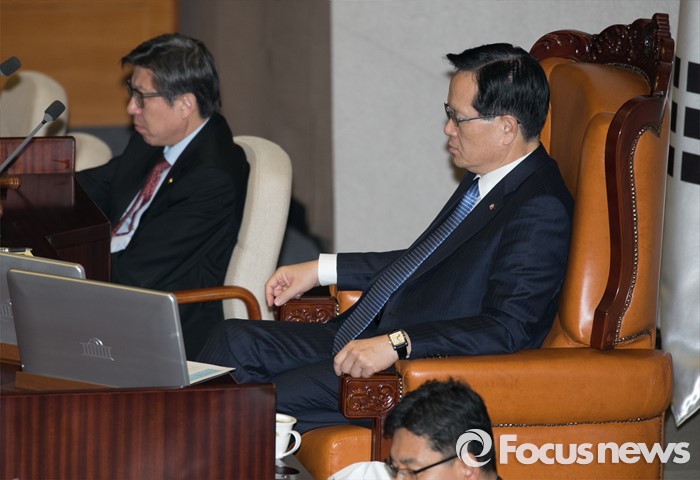 (서울=포커스뉴스) 테러방지법 직권상정에 반발해 야당의 무제한 토론(필리버스터)이 나흘째 진행되고 있는 26일 오전 서울 여의도 국회 본회의장에서 정의화 국회의장이 피곤한 듯 눈을 감고 앉아 있다.