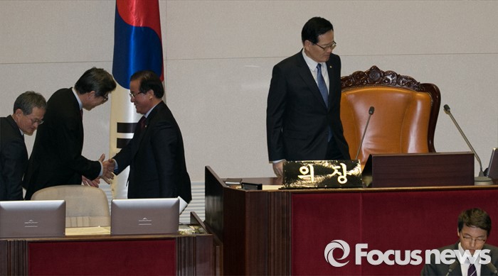 (서울=포커스뉴스) 테러방지법 직권상정에 반발해 야당의 무제한 토론(필리버스터)이 나흘째 진행되고 있는 26일 오전 서울 여의도 국회 본회의장에서 정의화 국회의장과 정갑윤 국회 부의장이 교대하고 있다.