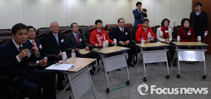 (서울=포커스뉴스) 26일 오전 서울 여의도 새누리당사에서 열린 20대 총선 공천 신청자 면접심사에 참석한 대구 중구남구 예비후보들이 면접 시작을 기다리고 있다. 곽상도, 김휘일 예비후보, 김희국 의원, 남달구, 남창모, 배영식, 이상목, 이인석, 조명희 예비후보.
