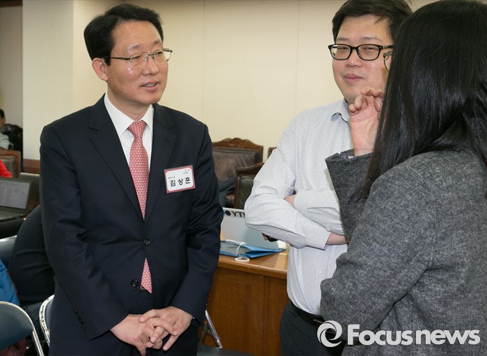 (서울=포커스뉴스) 26일 오전 서울 여의도 새누리당사에서 열린 20대 총선 공천 신청자 면접심사에 대구 서구에 신청한 김상훈 의원이 취재진과 대화하고 있다.