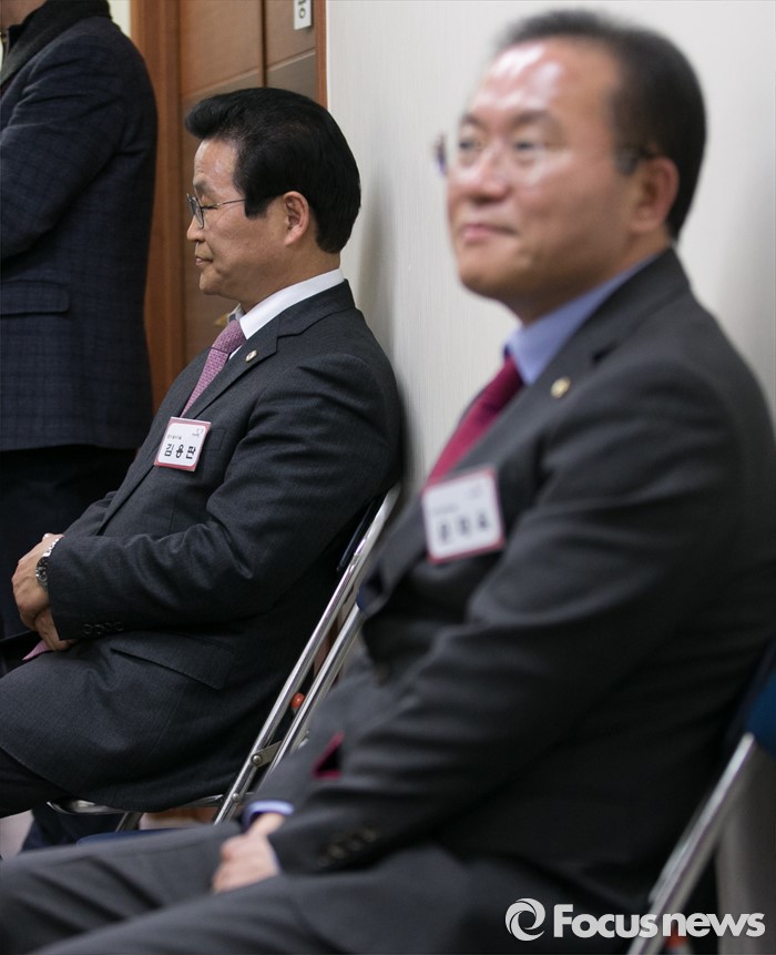(서울=포커스뉴스) 26일 오후 서울 여의도 새누리당사에서 열린 20대 총선 공천 신청자 면접심사에서 대구 달서을에 신청한 김용판(왼쪽) 전 서울지방경찰청장과 윤재옥 의원이 면접을 기다리고 있다.