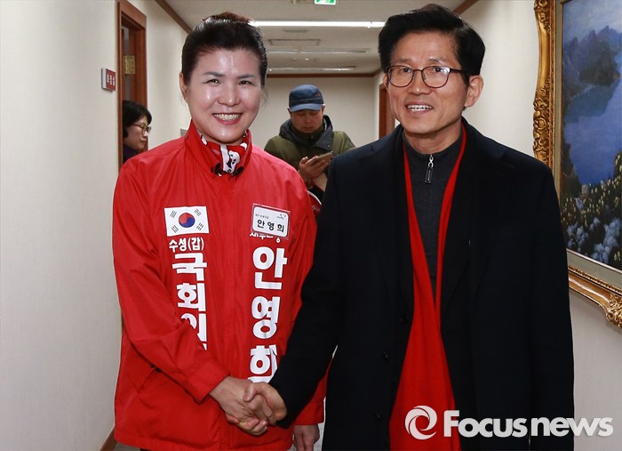 (서울=포커스뉴스) 26일 오후 서울 여의도 새누리당사에서 열린 20대 총선 공천 신청자 면접심사에 참석한 김문수(오른쪽), 안영희 대구 수성갑 예비후보가 취재진을 향해 포즈를 취하고 있다.