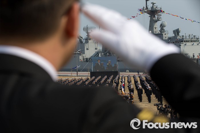 (서귀포=포커스뉴스) 한 해군 관계자가 26일 오후 제주 서귀포 제주해군기지에서 열린 '제주민군복합형관광미항' 준공식에서 축사가 끝난 황교안 국무총리를 향해 거수경례를 하고 있다.