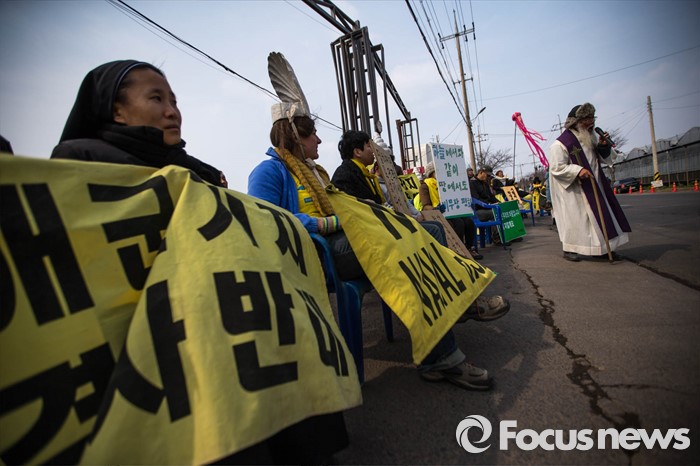 (서귀포=포커스뉴스) 문정현 신부가 26일 준공식이 열리는 제주민군복합형관광미항(제주해군기지) 정문 앞 부근에서 기지 건설을 반대하며 발언을 하고 있다.