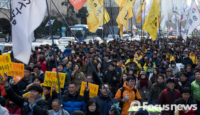 (서울=포커스뉴스) 27일 오후 서울광장에서 민주노총과 참여연대, 전국빈민연합 등 시민사회단체들이 4차 민중총궐기 집회를 마치고 행진하고 있다.