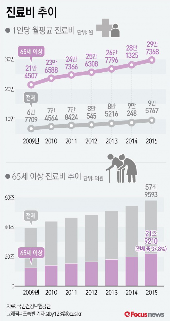 특히 65세이상 1인당 월평균 진료비는 29만7368원으로 1인당 월평균 진료비보다 3.1배 더 많았다.