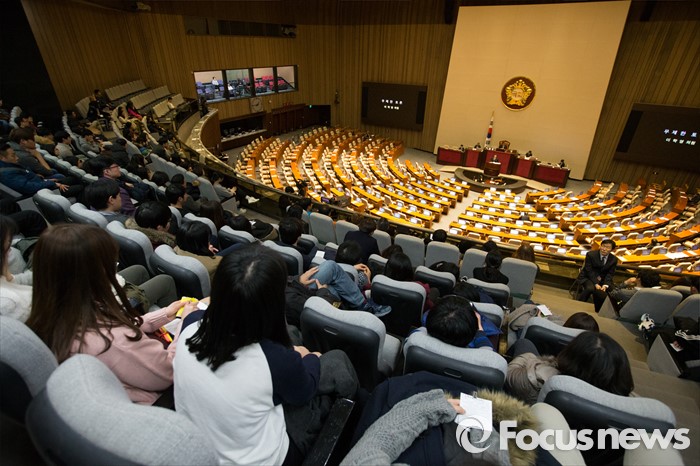 (서울=포커스뉴스) 테러방지법 직권상정에 반발해 야당의 무제한 토론(필리버스터)이 진행되고 있는 28일 오후 서울 여의도 국회 본회의 장에서 23번째 토론에 참여한 이학영 더불어민주당 의원이 발언하고 있는 가운데 시민 방청객들이 지켜보고 있다.