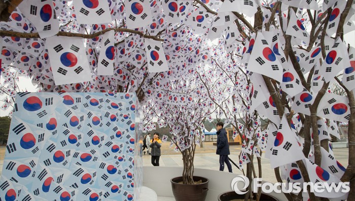 (천안=포커스뉴스) 3.1절을 이틀 앞둔 28일 오후 충남 천안 독립기념관을 찾은 시민들이 광장에 마련된 태극기 나무 앞에서 사진을 찍고 있다.