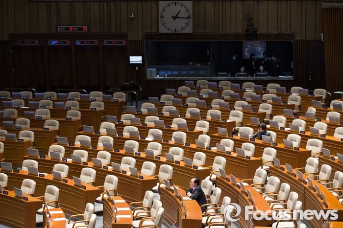 (서울=포커스뉴스) 테러방지법 직권상정에 반발해 야당의 무제한 토론(필리버스터)이 진행되고 있는 28일 오후 서울 여의도 국회 본회의 장에서 23번째 토론에 참여한 이학영 더불어민주당 의원이 발언하고 있는 가운데 이채익 새누리당 의원과 김영주 더불어민주당 의원이 자이에 앉아 있다.