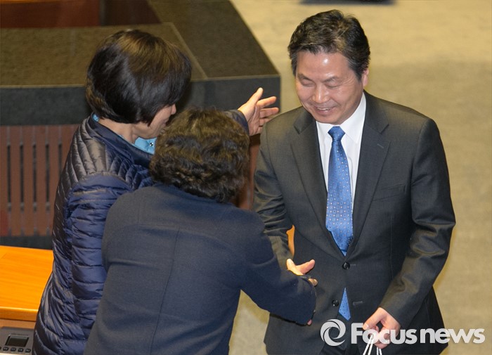 (서울=포커스뉴스) 테러방지법 직권상정에 반발해 야당이 무제한 토론(필리버스터)를 일주일째 진행하며 총 130시간을 돌파한 29일 오전 서울 여의도 국회 본회의장에서 토론을 마친 홍종학 더불어민주당 의원이 동료 의원들의 격려를 받고 있다.