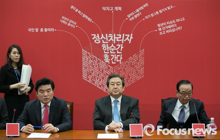 (서울=포커스뉴스) 29일 오전 서울 여의도 국회에서 열린 새누리당 최고위원회의에 참석한 김무성(가운데) 대표 등 지도부 뒤로 국민의 쓴소리 백보드가 보이고 있다.