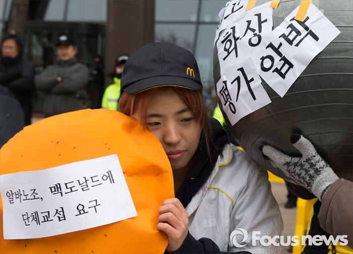 (서울=포커스뉴스) 29일 오전 서울 종로구 한국맥도날드본사 앞에서 알바노조 조합원들이 '45초 햄버거, 17분 30초 배달제 폐지' 등 10대 안건을 들고 단체교섭을 요구하는 퍼포먼스를 하고 있다.