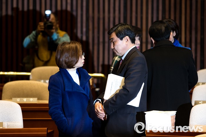 (서울=포커스뉴스) 이종걸 더불어민주당 원내대표가 29일 오후 서울 영등포구 국회에서 열린 의원총회에 자리해 은수미 더불어민주당 의원과 대화를 나누고 있다.