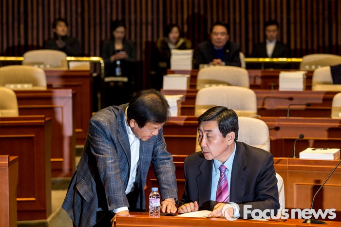 (서울=포커스뉴스) 이종걸(오른쪽) 더불어민주당 원내대표와 원혜영 더불어민주당 의원이 29일 오후 서울 영등포구 국회에서 열린 의원총회에 자리해 대화를 나누고 있다.