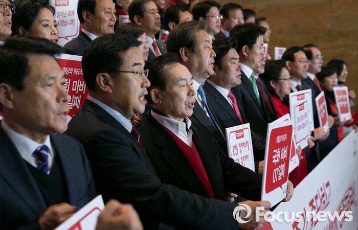 (서울=포커스뉴스) 김무성 새누리당 대표, 원유철 원내대표 등 의원들이 29일 오후 서울 여의도 국회에서 열린 의원총회를 마친 뒤 야당의 필리버스터(무제한 토론) 및 입법마비 규탄 결의대회를 하고 있다.