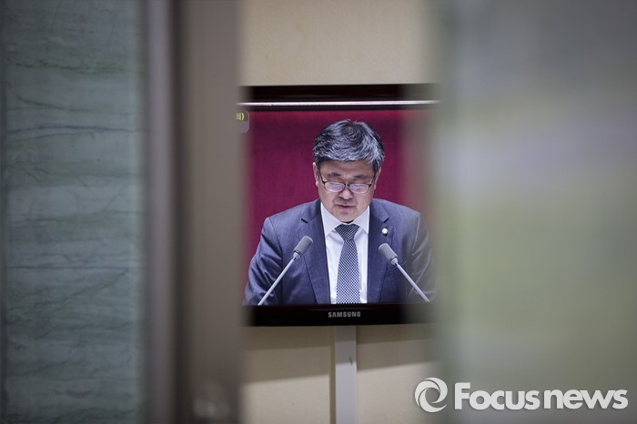 (서울=포커스뉴스) 테러방지법 직권상정에 반발해 야당이 무제한 토론(필리버스터)를 일주일째 진행하며 총 135시간을 돌파한 29일 오후 서울 여의도 국회 본회의장에서 토론에 참여한 최원식 국민의당 의원의 발언하는 모습이 회의장 입구 앞 모니터로 보이고 있다.