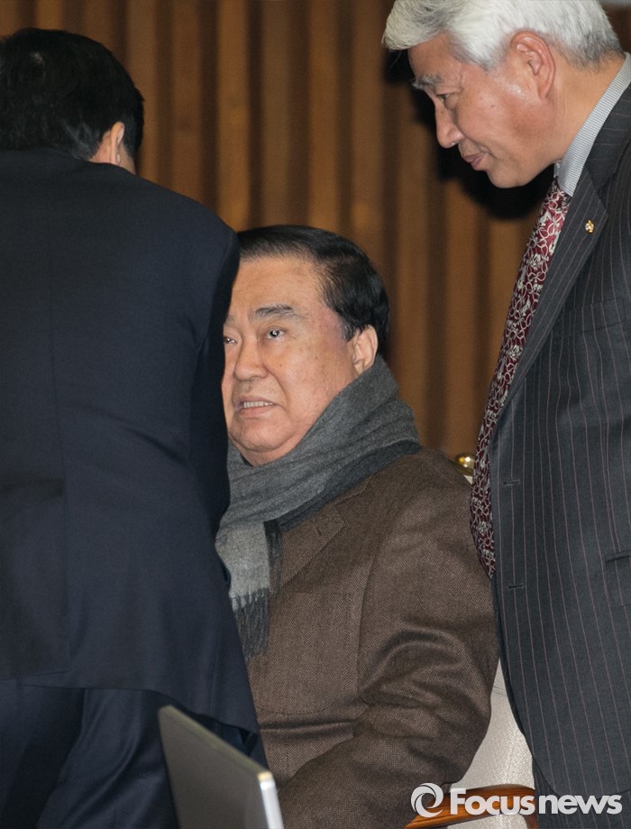 (서울=포커스뉴스) 테러방지법 직권상정에 반발해 야당이 무제한 토론(필리버스터)를 일주일째 진행하며 약 140시간을 돌파한 29일 오후 서울 여의도 국회 본회의장에서 현역 의원 하위 20% 컷오프(공천배제) 통보를 받은 문희상(가운데), 백군기(오른쪽) 더불어민주당 의원이 동료 의원들과 대화하고 있다.