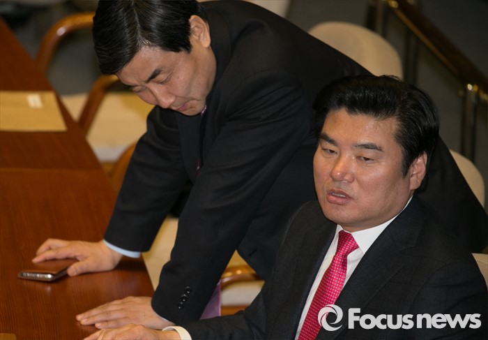 (서울=포커스뉴스) 테러방지법 직권상정에 반발해 야당이 무제한 토론(필리버스터)를 일주일째 진행하며 약 140시간을 돌파한 29일 오후 서울 여의도 국회 본회의장에서 원유철(오른쪽) 새누리당 원내대표와 이종걸 더불어민주당 원내대표가 대화하고 있다.