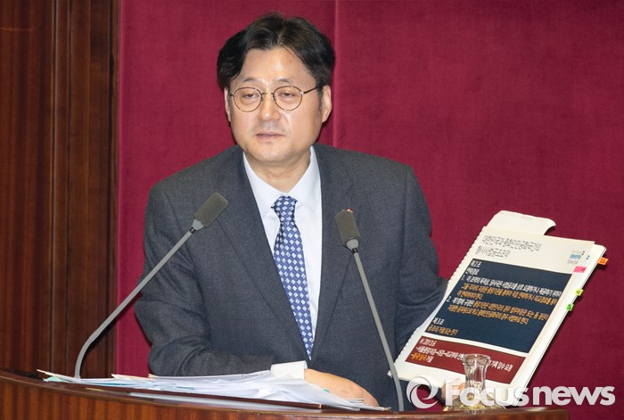 (서울=포커스뉴스) 테러방지법 직권상정에 반발해 야당이 무제한 토론(필리버스터)를 일주일째 진행하며 약 140시간을 돌파한 29일 오후 서울 여의도 국회 본회의장에서 토론에 참여한 홍익표 더불어민주당 의원이 발언하고 있다.